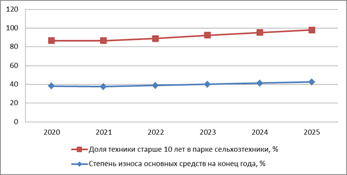 Рисунок 1. Динамика степени износа основных средств и доли техники старше 10 лет в сельском хозяйстве РФ (2020-2025 гг.)